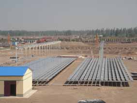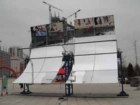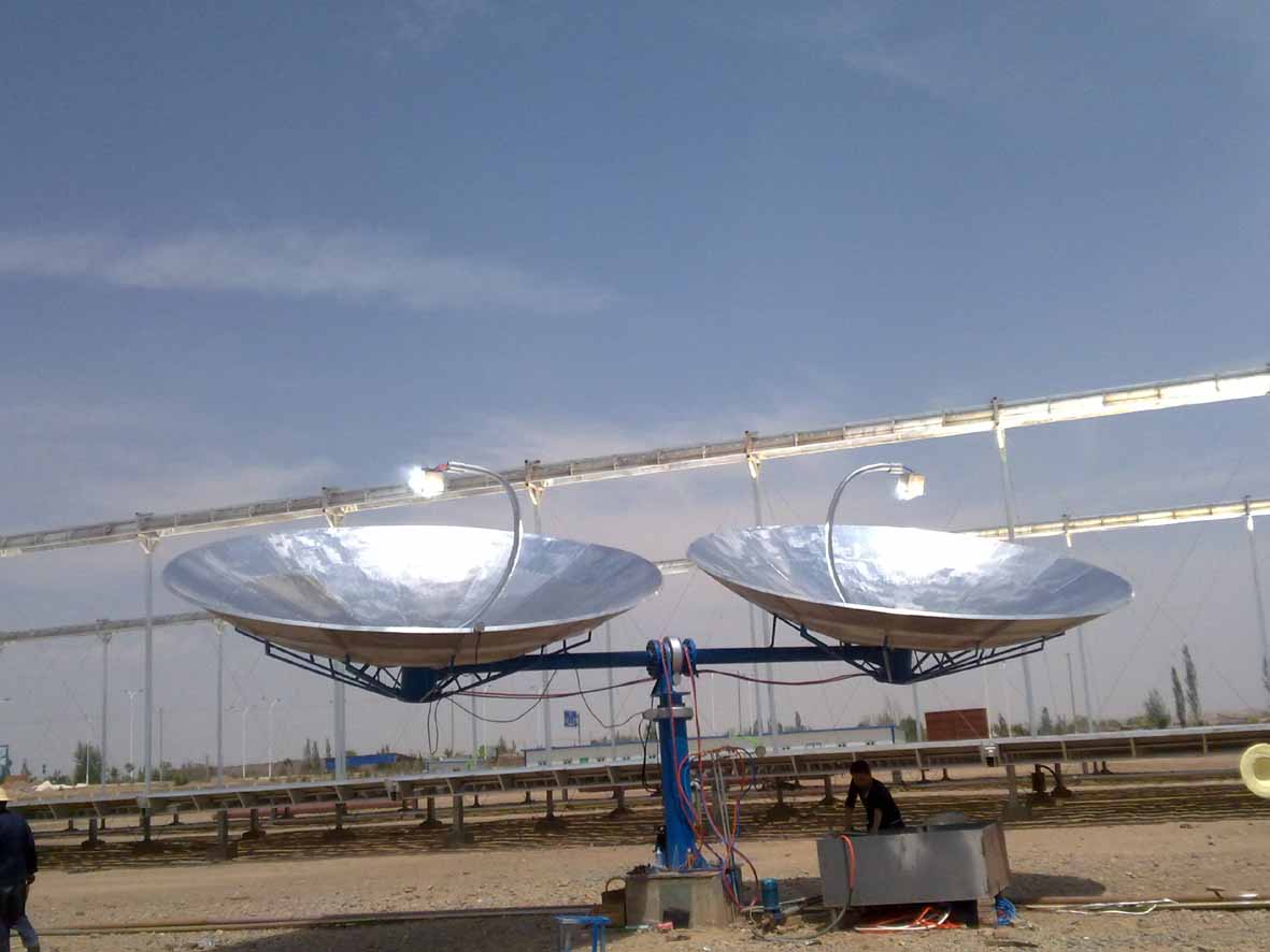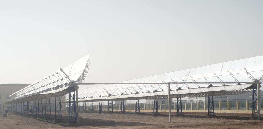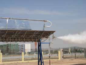 槽式太阳能集热系统是将多个线性抛物面聚光器经过串并联的排列,汇聚太阳直射光,加热真空集热管中的工质,产生高温。可用于太阳能光热发电,也可以广泛地应用于建筑采暖、太阳能空调、纺织、印染、造纸、海水淡化、食品加工等需要蒸汽热能的工业和民生领域。联盟研制的槽式太阳能集热系统已于2011年6月组装完成,在试机过程中产生温度为320℃,压力为25kg。