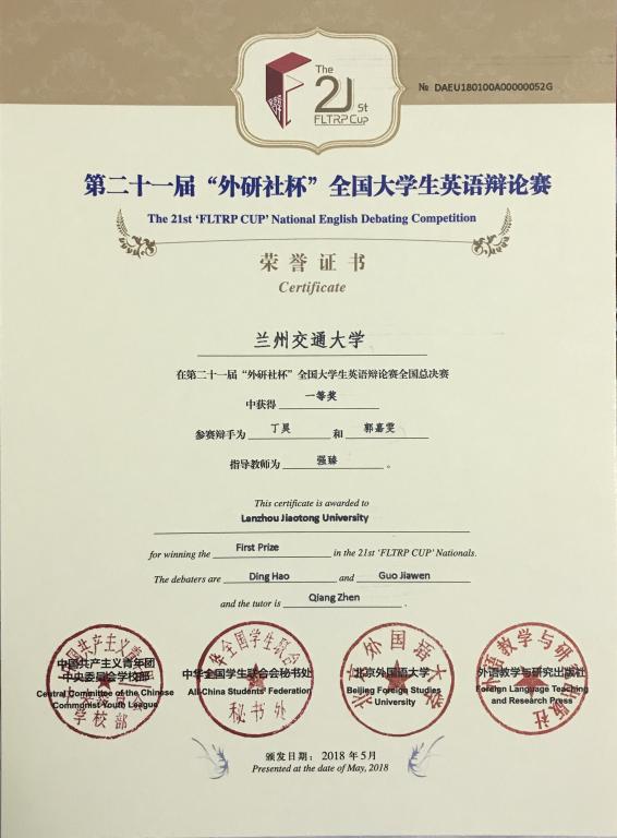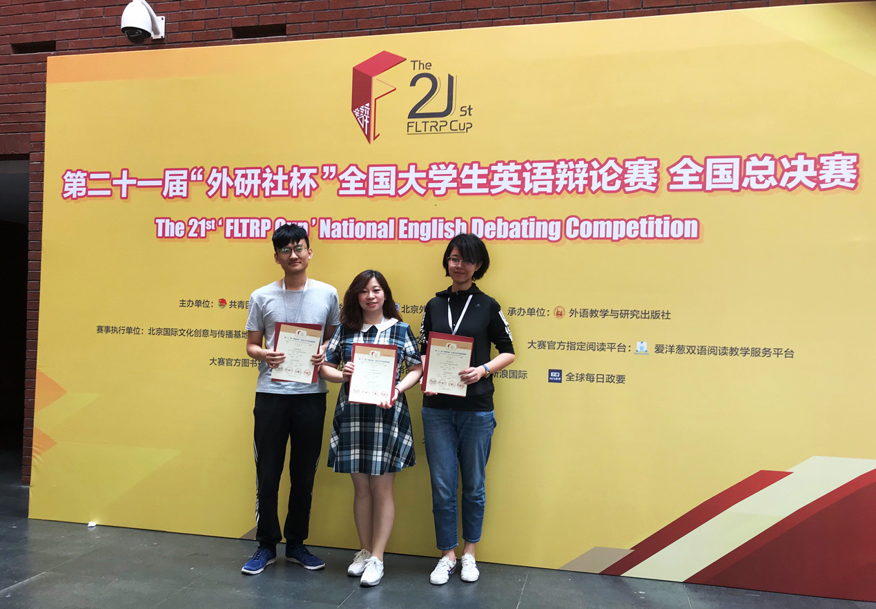 5月22日, 2018年第21届“外研社杯”全国大学生英语辩论赛全国总决赛在北京外国语大学圆满落幕。来自全国东、西、南、北四大赛区的109支队伍,在六天的时间里展开了精彩角逐。经过8轮循环赛,由我校外国语学院强臻老师指导、外国语学院学生郭嘉雯及电信学院学生丁昊组成的casino38365365代表队表现优异,荣获全国大学生英语辩论赛全国总决赛一等奖。这也是我省高校在此项赛事中获得的历史最好成绩。
