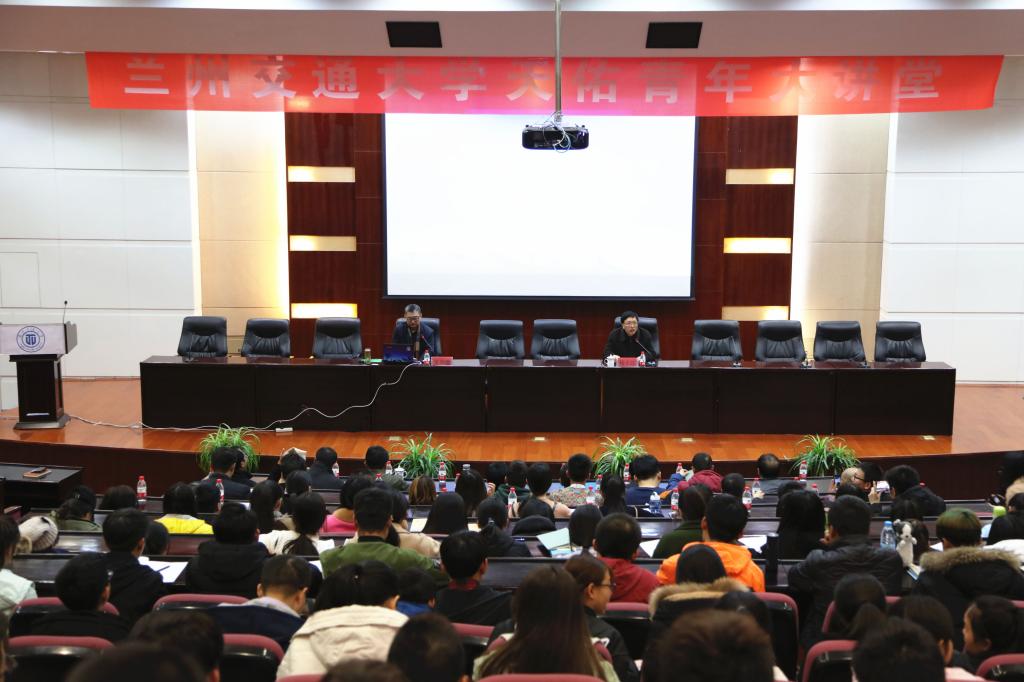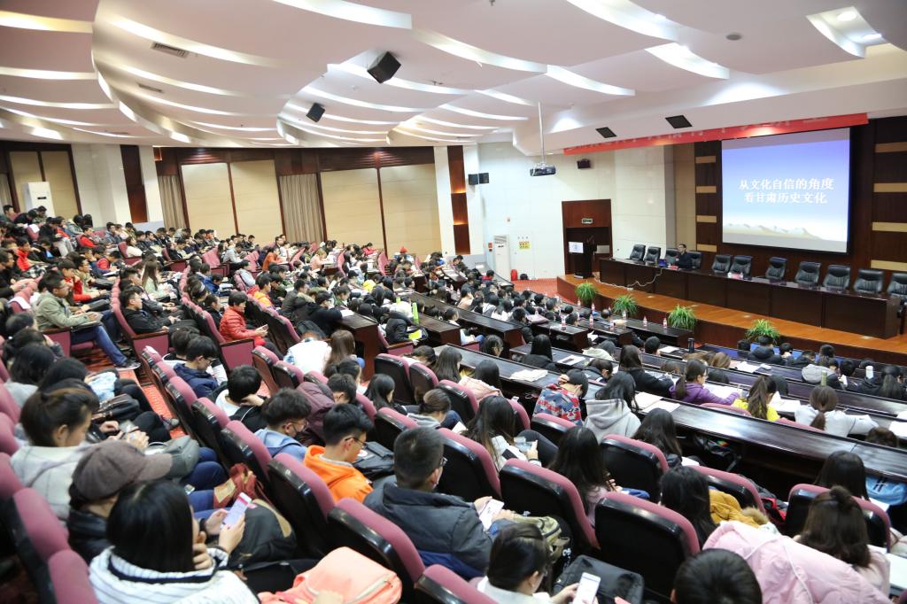 12月5日晚,由校团委、科技处主办,书法文化研究所、学生社团联合会和天佑青年传媒中心承办的天佑青年大讲堂专题报告会在行政楼国际会展中心举办。甘肃省文联党组成员、副主席王登渤应邀做客天佑青年大讲堂,做了题为《从文化自信的角度解读甘肃历史文化》专题报告。报告会由杨子江校长主持,校团委、科技处和文学院相关负责人,相关学院学生代表约350人参加了报告会。