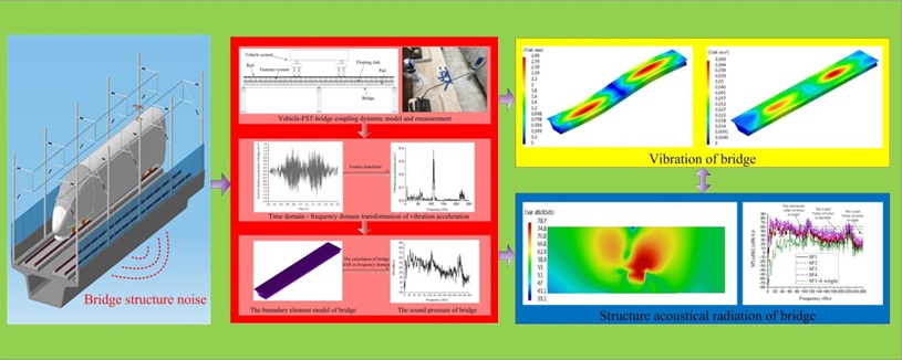 该学术论文以我国某城市轨道交通机场线高架段为工程背景,基于翟婉明院士提出的列车-轨道-桥梁相互作用理论以及结构声学原理,对我国城市轨道交通混凝土箱梁桥结构的发声机理和声辐射特性进行了系统研究。建立了计算桥梁结构振动发声的列车-轨道-桥梁相互动力作用精细模型,与预测声辐射特性的声学模型。首次研究了桥梁结构的次声辐射特性,将桥梁结构声辐射问题的研究频段扩展到低于可听阈以下,并且将突发性噪声引入到桥梁结构声辐射评价体系,揭示了城市轨道交通混凝土箱型桥梁结构的发声机理。